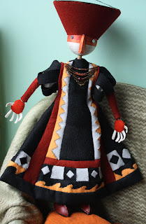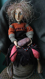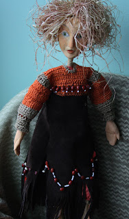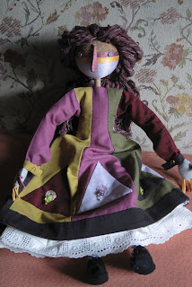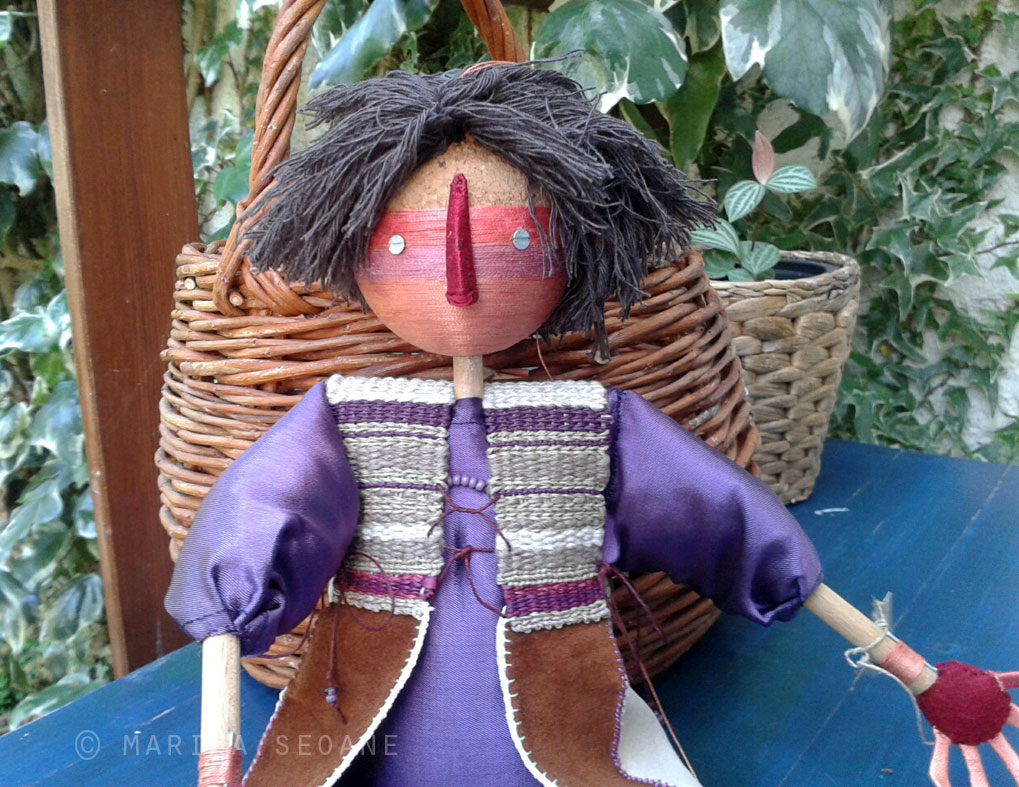 Marioneta realizada totalmente a mano con pasta de papel. El cuerpo es de tela rellena de algodón sintético. La ropa está cosida a mano. La parte central del vestido está realizada en telar a modo de mis colgantes textiles. El pelo es de algodón teñido a mano; zapatos de ante.