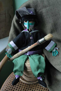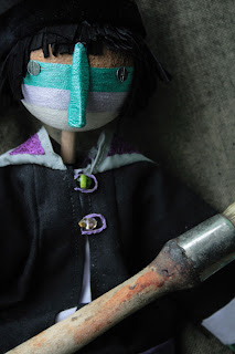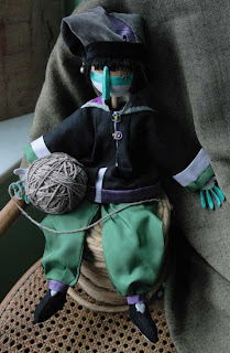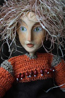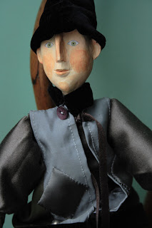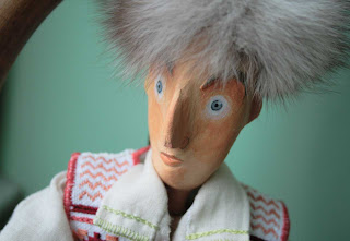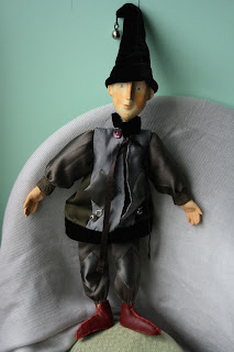 Marioneta modelada a mano con pasta de papel. El cuerpo es de tela rellena de fibra.