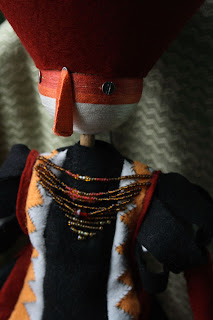 Aquí la realización de la marioneta cambia, la cabeza, manos y pies están hechos de pasta de papel coloreada con acuarela y barnizada. La camisa es de hilo de algodón bordado y adornado de cuentas de cristal. Los pantalones están hechos uniendo tiras de raso y algodón verde. Los zapatos son de cuero. Lleva una bufanda de algodón con apliques de otro color.